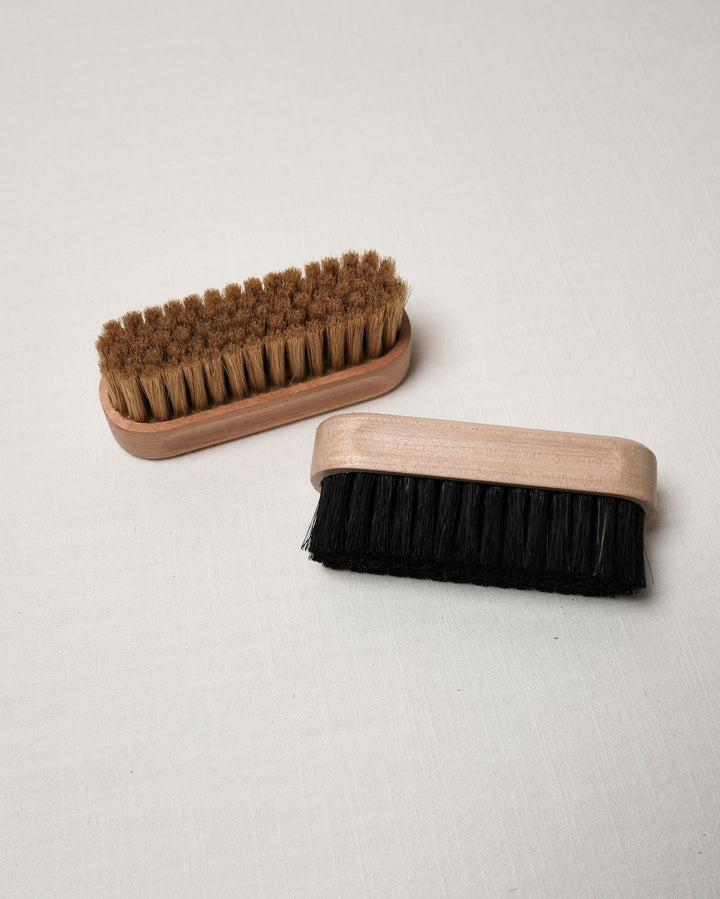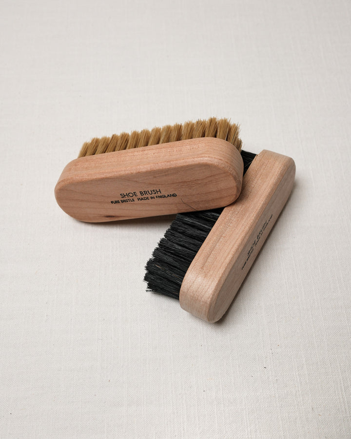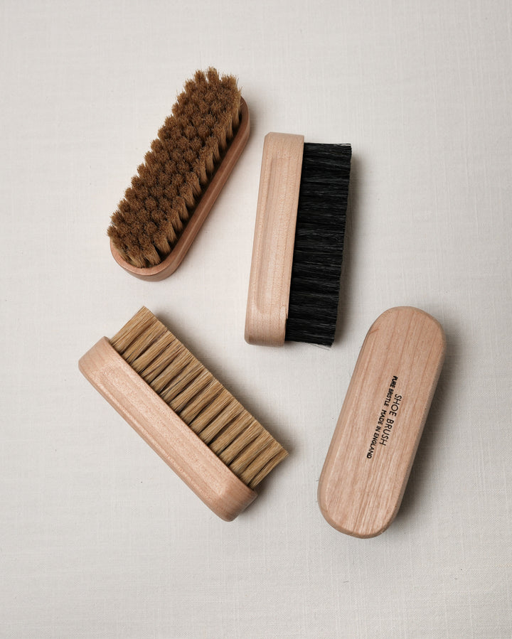 This shoe brush is handmade by one of the few remaining traditional workshops in England, carefully crafted with natural hog bristles and a wooden handle. The bristles are firm yet flexible, effectively removing dust while protecting the shoe surface. Compact and comfortable to hold, it makes daily shoe care a simple and enjoyable task.