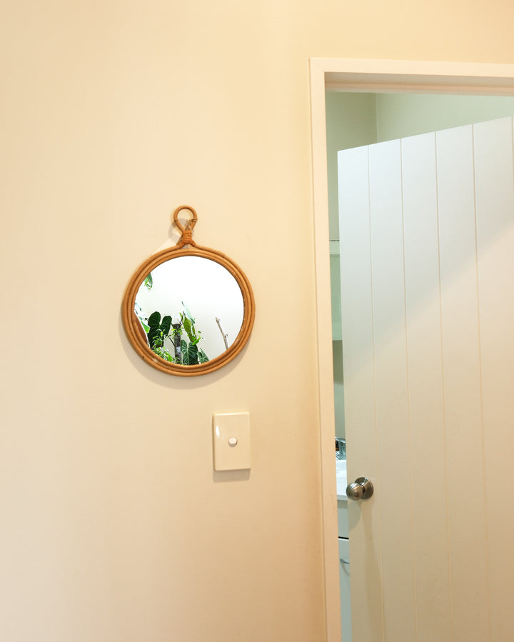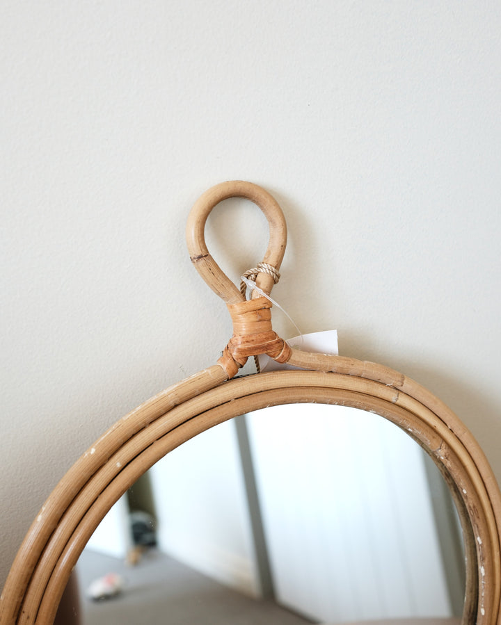 Handwoven from natural rattan, this piece brings a touch of nature into your home. The back features a hanging hook, and it can also be held by the handle for use as a makeup mirror.