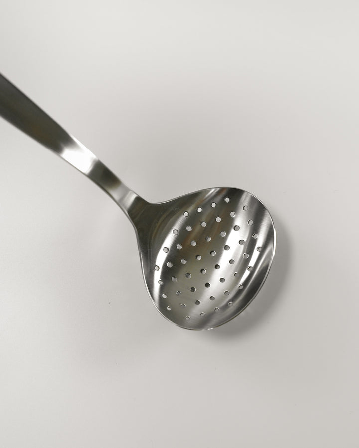 The Sori Yanagi Stainless Steel Skimmer is a finely crafted kitchen tool designed for effortless straining and scooping. Made in Japan from high-quality stainless steel, it features a sleek, ergonomic handle for a comfortable grip and a perforated design for efficient draining. Perfect for skimming soups, blanching vegetables, and frying, this durable and elegant skimmer embodies Sori Yanagi’s signature blend of functionality and timeless design.